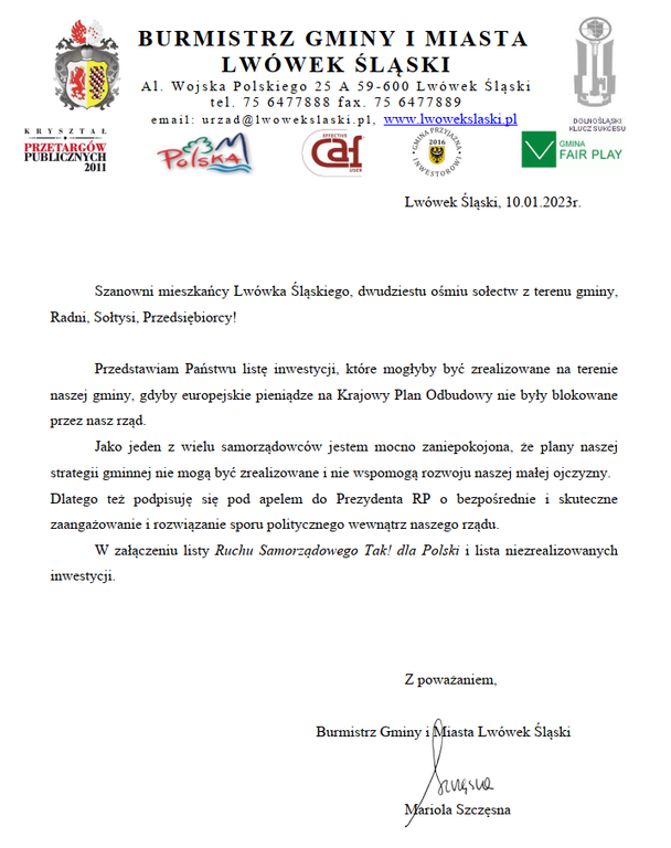 W załączeniu listy Ruchu Samorządowego Tak! dla Polski i lista niezrealizowanych inwestycji.