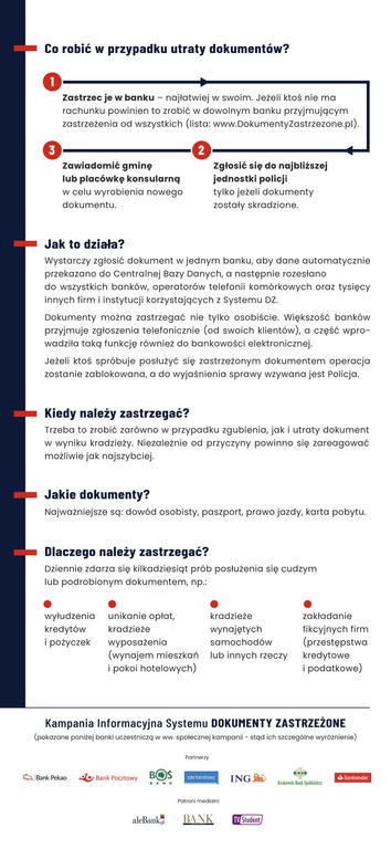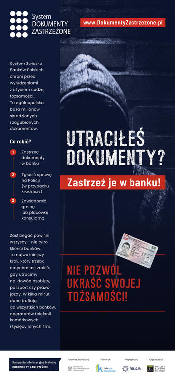Przypominamy, że utracone dokumenty tożsamości powinny w bankach zastrzegać nie tylko osoby, które mają już konta bankowe, ale również te, które z usług bankowych nigdy nie korzystały lub już nie korzystają (lista banków zastrzegających dokumenty od wszystkich osób).