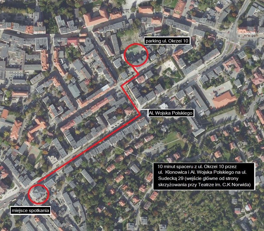 Uwaga techniczna dot. parkingu: informujemy o możliwości nieodpłatnego pozostawienia samochodu na parkingu przy budynku UMJG przy ul. Okrzei 10 (w podwórku), co wiąże się z 10 minutami spaceru między parkingiem a miejscem spotkania. Ze względu na liczbę interesantów korzystających z Centrum Obsługi Mieszkańca UMJG na ul. Ptasiej, często zdarzają się problemy z parkowaniem na parkingu pomiędzy budynkami Urzędu Miasta w Jeleniej Górze położonymi przy ul. Sudeckiej i Ptasiej. W załączeniu przekazuję mapkę z lokalizacją parkingu.