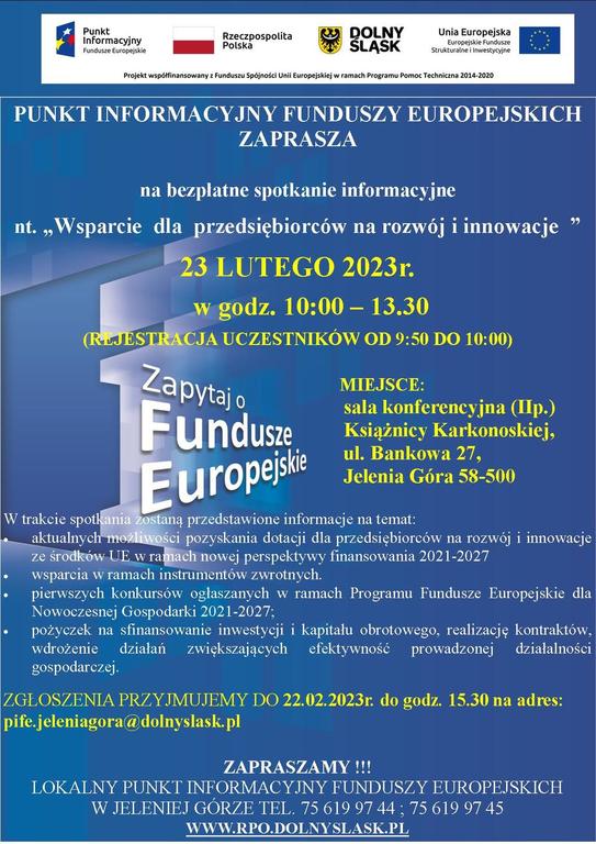 Urząd Marszałkowski Województwa Dolnośląskiego we Wrocławiu – Punkt Informacyjny Funduszy Europejskich w Jeleniej Górze zapraszają przedsiębiorców, w tym mikro, małych i średnich z obszaru Dolnego Śląska do udziału w bezpłatnym spotkaniu informacyjnym pt. „Wsparcie dla przedsiębiorców na rozwój i innowacje”.