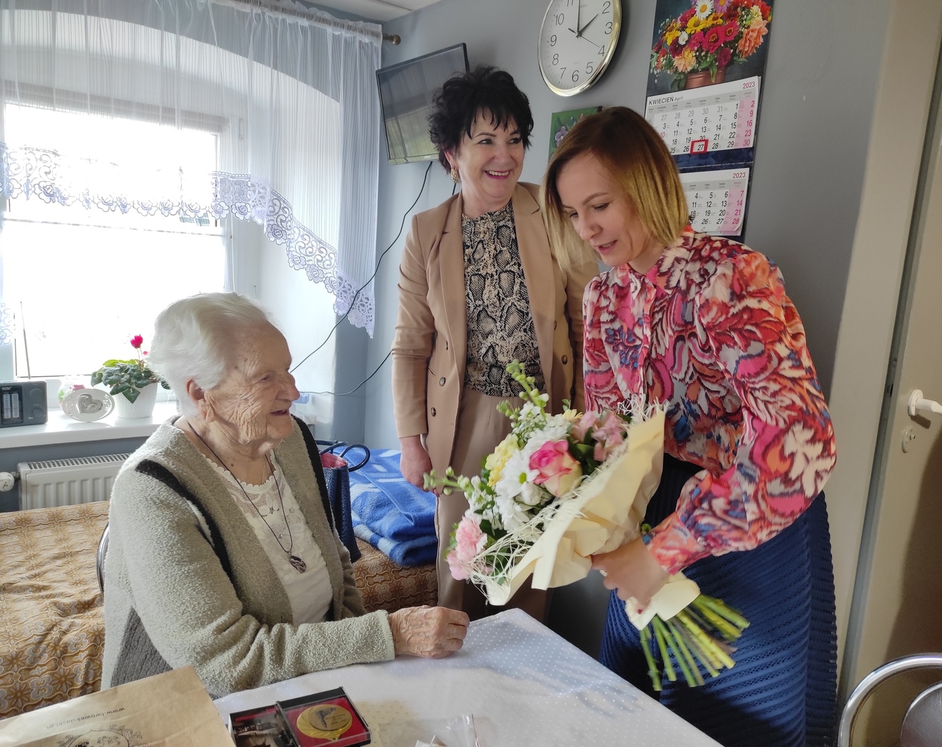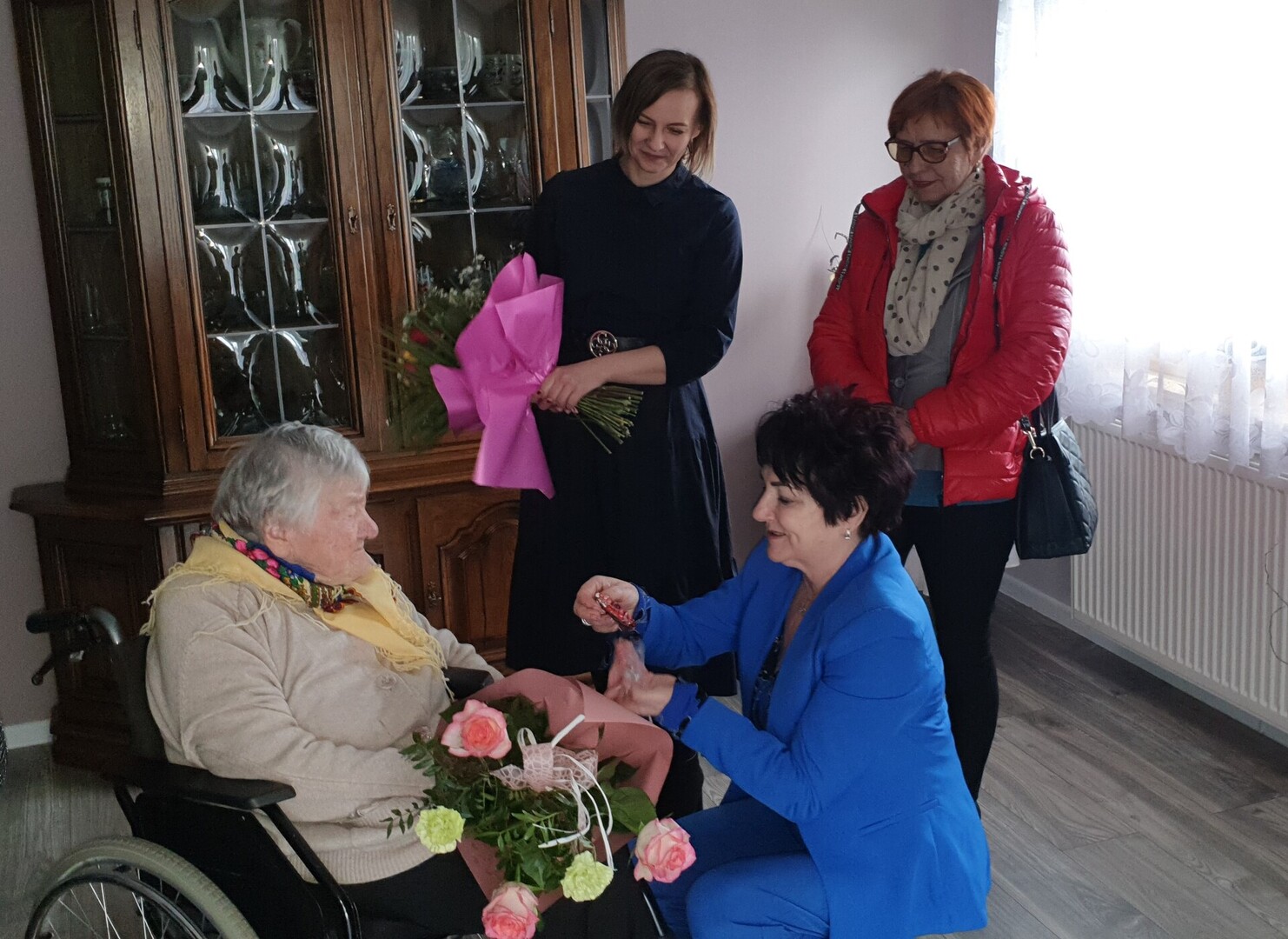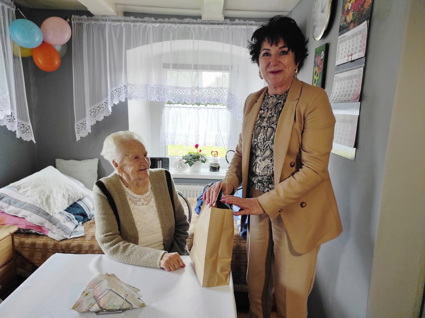 Pięknego jubileuszu doczekała się również pani Józefa Mieszczanowicz, która w Sobocie świętowała swoje setne urodziny. Z tej okazji, jubilatkę odwiedziły: Pani Burmistrz, Pani Kierownik USC oraz Pani Sołtys Ewa Malińska.