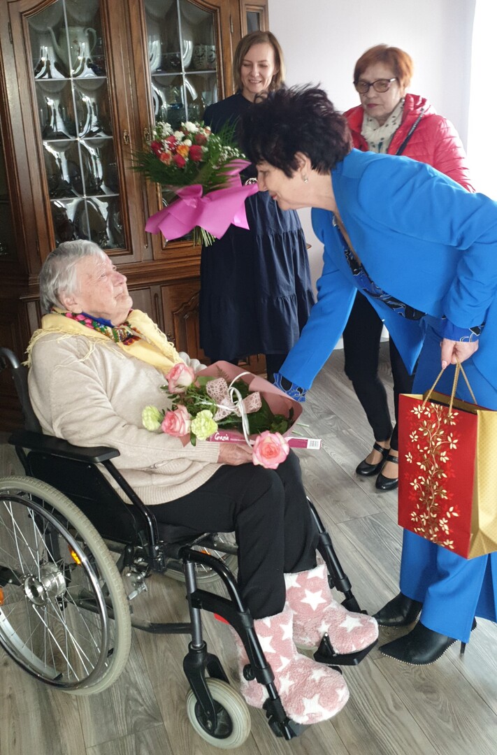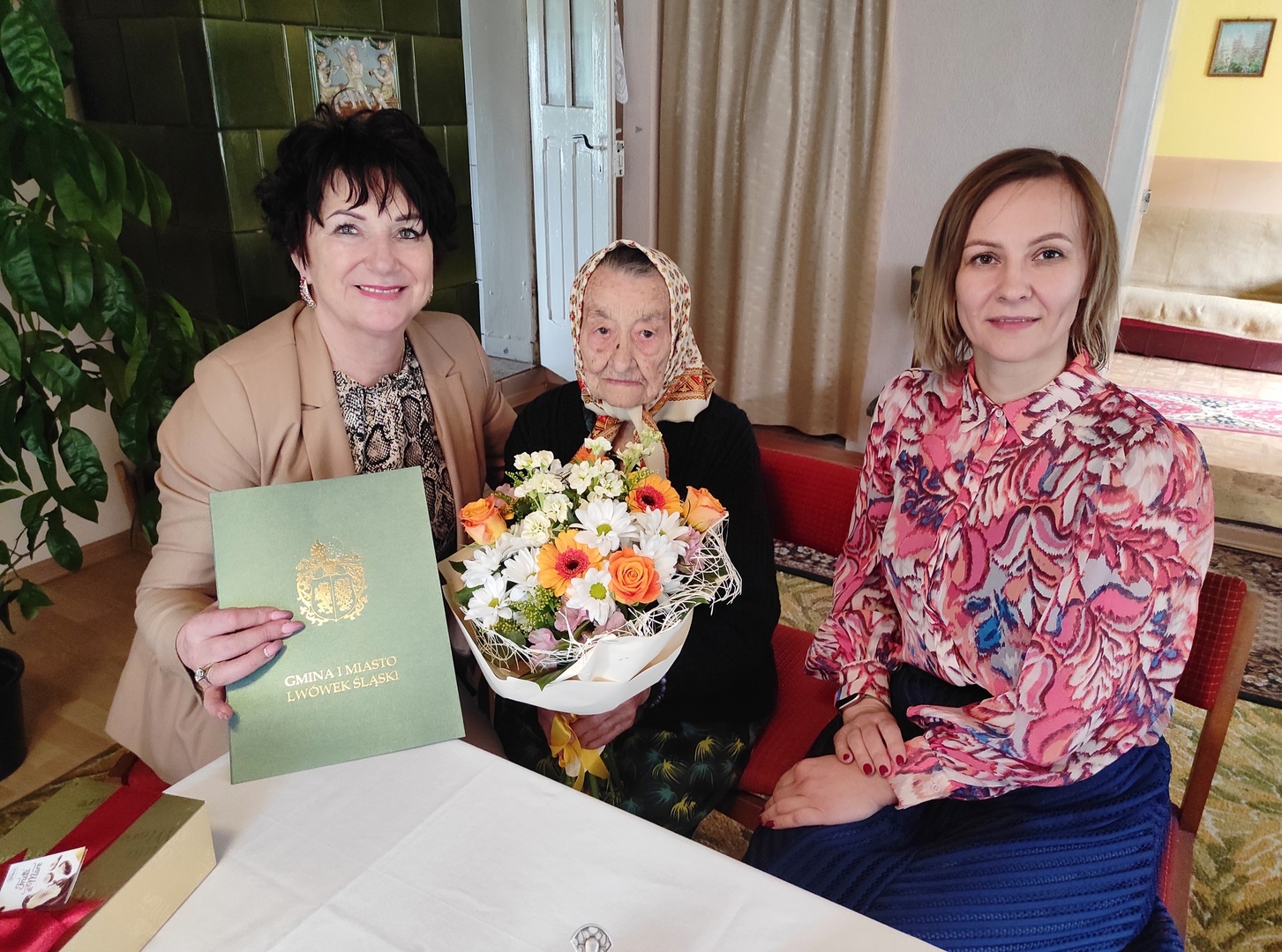 Panią Bronisławę Wutowicz, dostojną jubilatkę w kwietniu br. odwiedziły: Burmistrz Gminy i Miasta Lwówek Śląski Pani Mariola Szczęsna, Radna Stefania Wróblewska oraz Kierownik USC Pani Dominika Rzeźwicka.