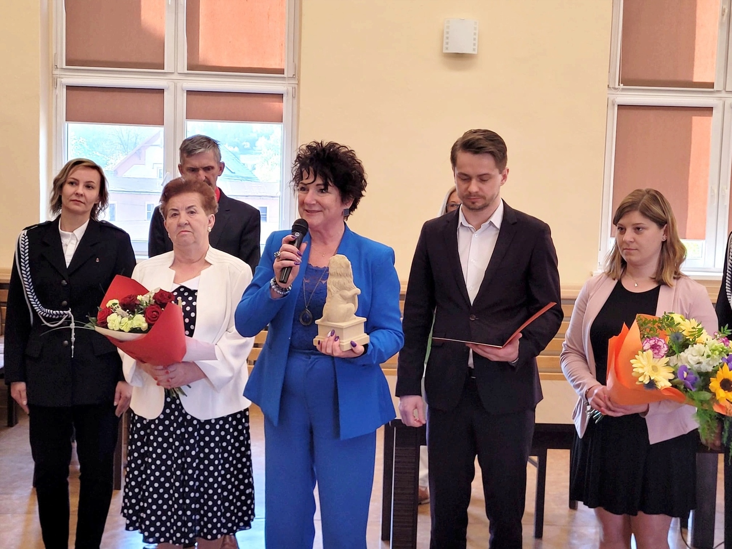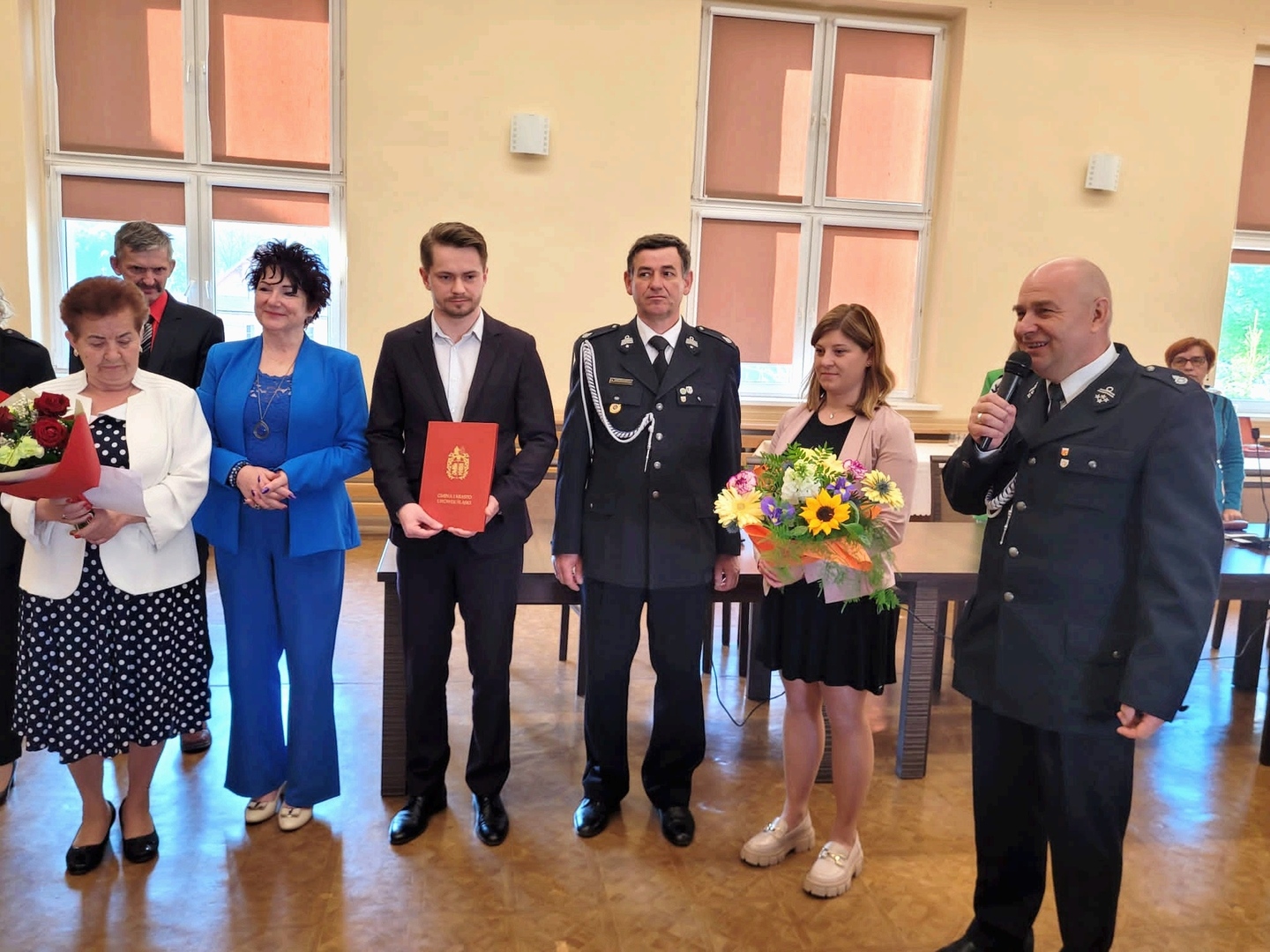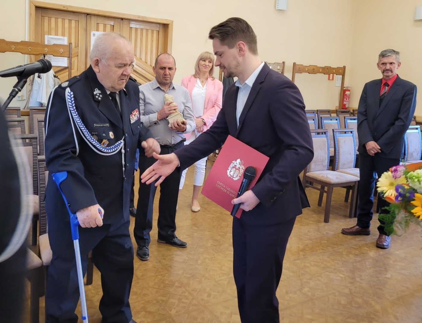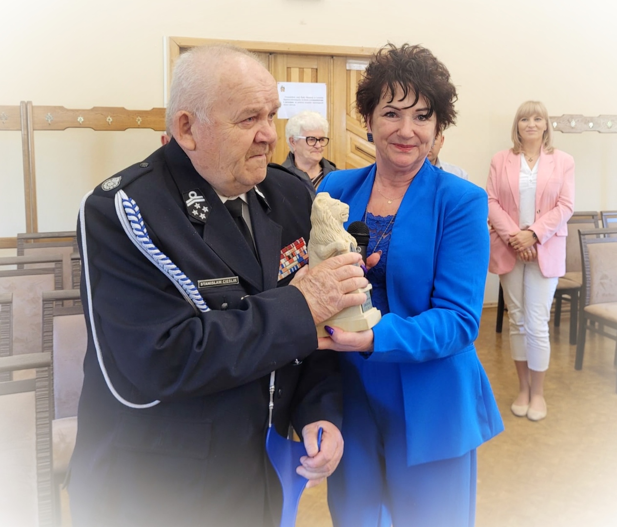 Zaszczytne wyróżnienie wręczyła w piątek 12 maja Pani Burmistrz Mariola Szczęsna, podczas LXVII Sesja Rady Miejskiej w Lwówku Śląskim. Gratulacje i życzenia złożyli również: Przewodniczący Rady Miejskiej Dawid Kobiałka, radny Franciszek Pawłowicz pełniący jednocześnie funkcję prezesa zarządu Oddziału Miejsko-Gminnego Związku Ochotniczych Straży Pożarnych, radny Tadeusz Koblak, Komendant Miejsko-Gminnego Związku OSP Artur Drozdowicz, Pani Paulina Sztuba z Wydziału Spraw Obywatelskich, Pani Stanisława Buganik sołtys ze Zbylutowa oraz kierownik USC Dominika Rzeźwicka, tym razem w dodatkowej roli przedstawiciela OSP Zbylutów.