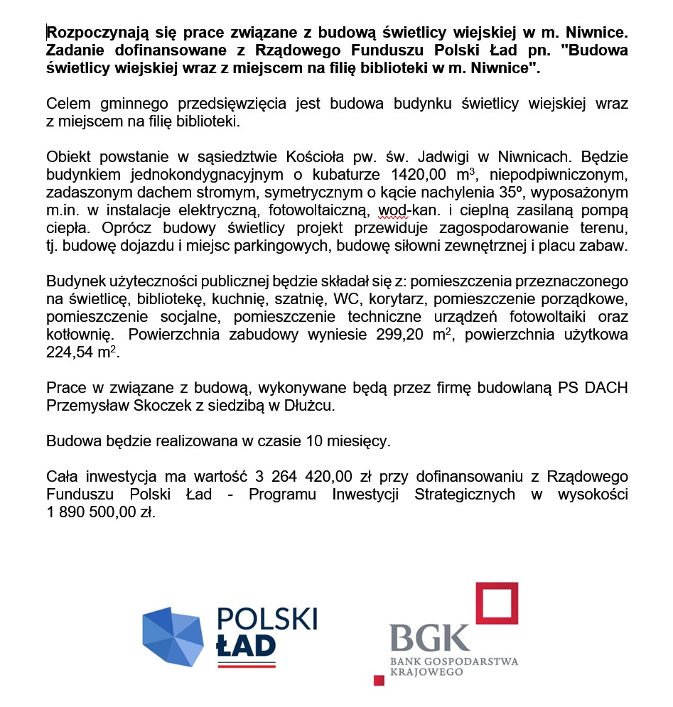 Zadanie dofinansowane z Rządowego Funduszu Polski Ład pn. "Budowa świetlicy wiejskiej wraz z miejscem na filię biblioteki w m. Niwnice".