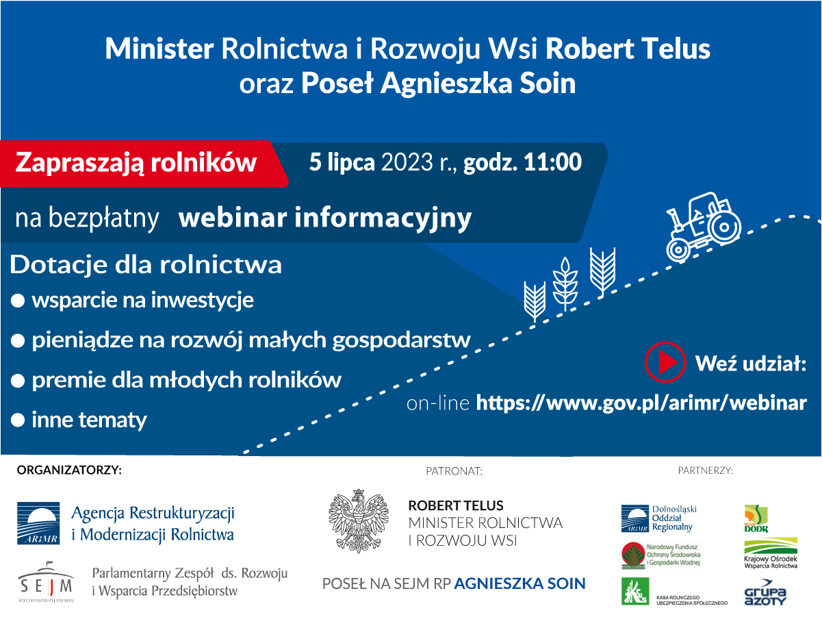 Webinar pod patronatem: Ministra Rolnictwa i Rozwoju Wsi pana Roberta Telusa i Poseł na Sejm RP pani Agnieszki Soin