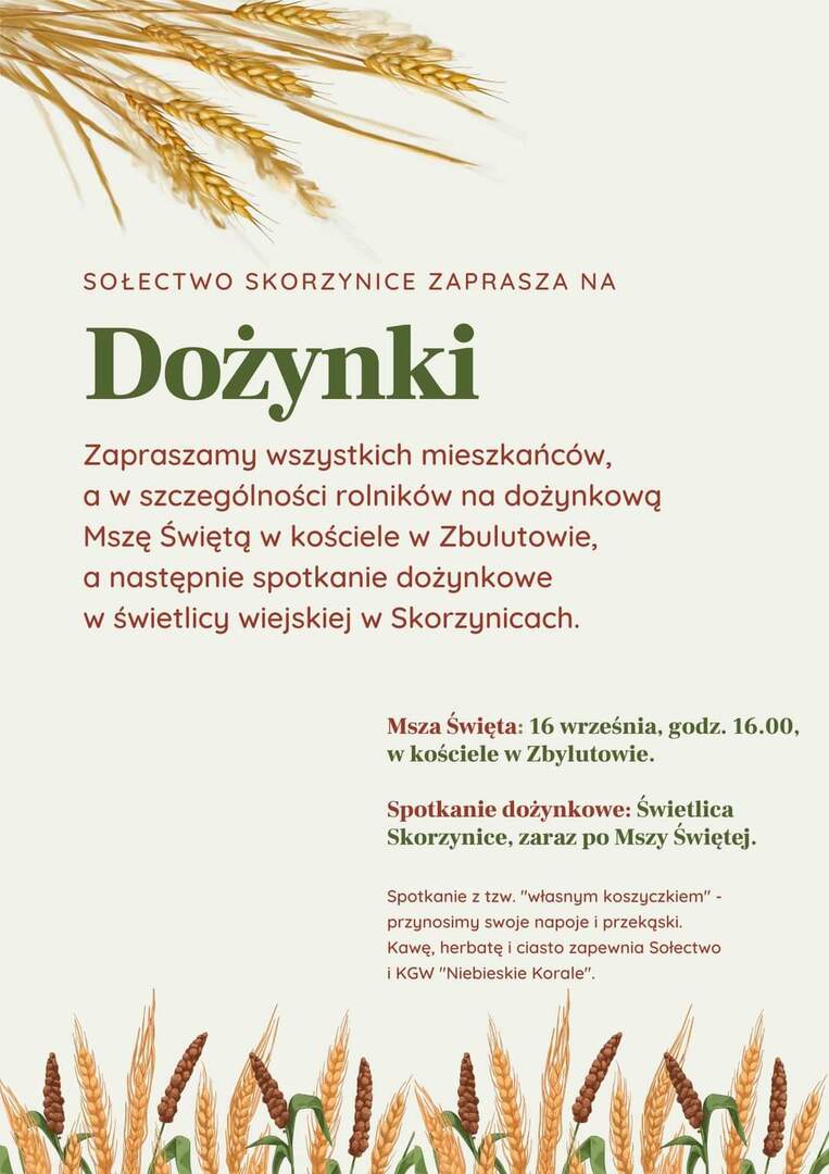 Msza odbędzie się w kościele w Zbylutowie, 16 września o godzinie 16.oo, a tuż po niej zapraszamy wszystkich do świetlicy w Skorzynicach, gdzie wspólnie będziemy celebrować święto plonów.