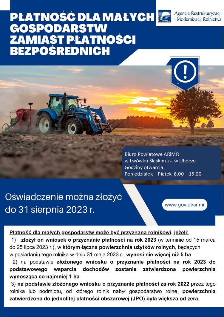 W celu otrzymania płatności dla małych gospodarstw należy w terminie do 31 sierpnia 2023 r. złożyć za pośrednictwem Platformy Usług Elektronicznych (aplikacja eWniosekPlus) skan oświadczenia „Żądanie przyznania płatności dla małych gospodarstw”, którego wzór znajduje się stronie internetowej ARiMR: https://www.gov.pl/web/arimr/platnosc-dla-malych-gospodarstw-2023