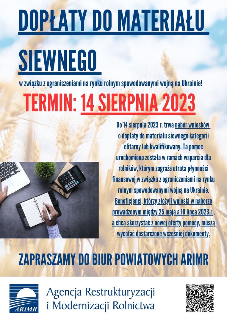Więcej informacji o naborze wniosków o dopłaty do materiału siewnego oraz wzór wniosku znajduje się stronie internetowej ARiMR: https://www.gov.pl/web/arimr/platnosc-dla-malych-gospodarstw-2023